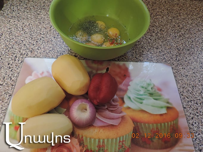 Մեկ-երկու րոպեից ավելացրեք բարակ կտրատած կարտոֆիլը: Փակ կափարիչով եփեք մոտ քսան րոպե, մինչեւ կարտոֆիլն ամբողջությամբ փափկի: Պարբերաբար պետք է խառնել, որպեսզի կարտոֆիլն ու սոխը տապակվեն, բայց չկարմրեն: Եթե թարմ պղպեղ եք ավելացնելու, ավելացրեք կարտոֆիլի հետ միաժամանակ: