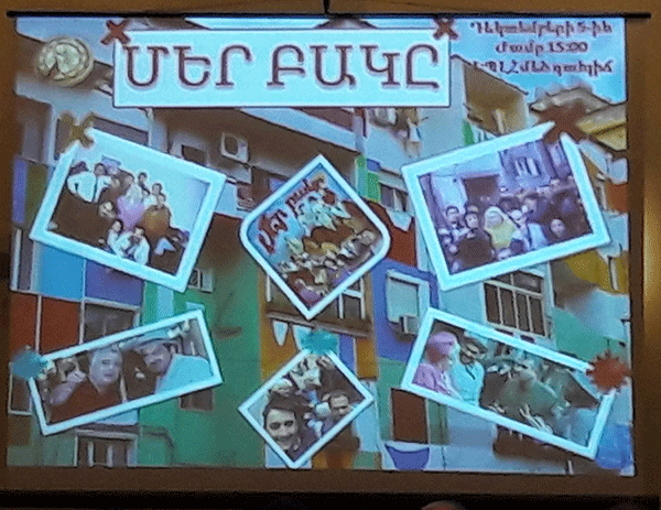 Հանդիպումը տեղի ունեցավ հարց պատասխանի ձևով, ինչպես նաև ցուցադրվեց ֆիլմ «Մեր բակ»-ի մասին, որը պատրաստել էին ուսանողները: