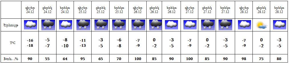 Դեկտեմբերի 24-27-ը ժամանակ առ ժամանակ, դադարներով սպասվում է թույլ ձյուն: 28-ին սպասվում է առանց տեղումների եղանակ: