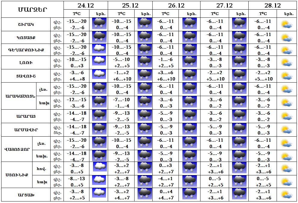 Դեկտեմբերի 24-ին Շիրակում, Կոտայքում, Արագածոտնում, Արարատում, Արմավիրում և Վայոց Ձորում, 25-27-ը շրջանների զգալի մասում սպասվում է թույլ ձյուն, առանձին հատվածներում՝ բուք, ցածր տեսանելիություն: 28-ին սպասվում է առանց տեղումների եղանակ: