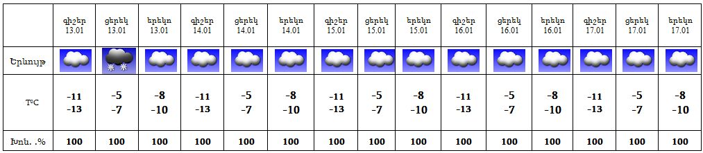 Հունվարի 13-ին՝ կեսօրից հետո, սպասվում է թույլ ձյուն, գիշերը և առավոտյան` մառախուղ: 14-17-ը սպասվում է առանց տեղումների եղանակ: Բոլոր օրերին ամպամածությունը և մառախուղը կպահպանվի: