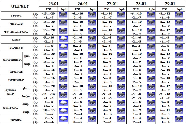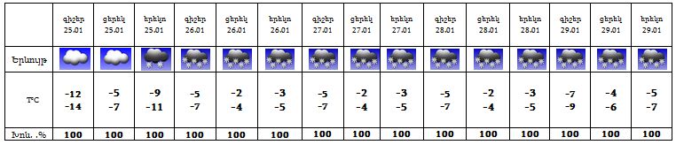 Հունվարի 25-ի գիշերը սպասվում է առանց տեղումների եղանակ: 25-ի երեկոյան ժամերից, 26-29-ը սպասվում է ձյուն: