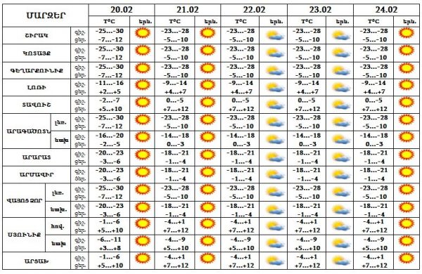 Փետրվարի 20-24-ին սպասվում է առանց տեղումների եղանակ: Քամին՝ հյուսիս-արևելյան՝ 3-8 մ/վրկ արագությամբ: