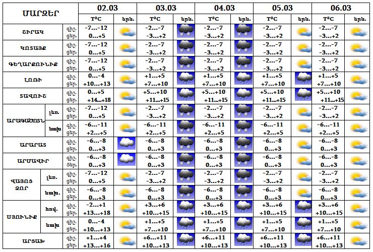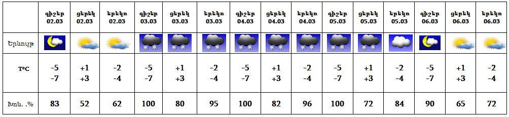 Մարտի 2-ին, 5-ի ցերեկը, 6-ին սպասվում է առանց տեղումների եղանակ, 3-4-ը, 5-ի գիշերը ժամանակ առ ժամանակ սպասվում է թույլ ձյուն: Ցածրադիր հատվածներում սպասվում է մառախուղ: