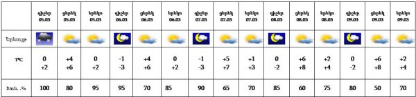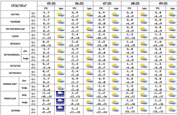 Մարտի 5-ի գիշերը ժամանակ առ ժամանակ սպասվում են տեղումներ, 5-ի ցերեկը, 6-9-ը սպասվում է առանց տեղումների եղանակ: