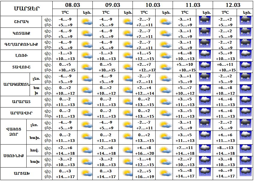 Մարտի 8-10-ին, 11-ի գիշերը սպասվում է առանց տեղումների եղանակ, 11-ին կեսօրից հետո, 12-ին շրջանների զգալի մասում ժամանակ առ ժամանակ սպասվում են տեղումներ, լեռնային գոտիներում՝ թաց ձյան և ձնախառն անձրևի, նախալեռնային և հովտային գոտիներում՝ անձրևի տեսքով: