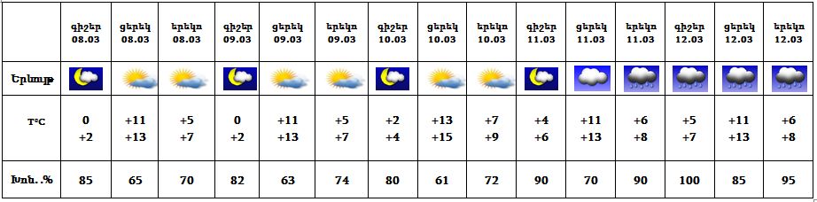Մարտի 8-10-ին, 11-ի գիշերը սպասվում է առանց տեղումների եղանակ, 11-ին կեսօրից հետո, 12-ին ժամանակ առ ժամանակ սպասվում է անձրև: