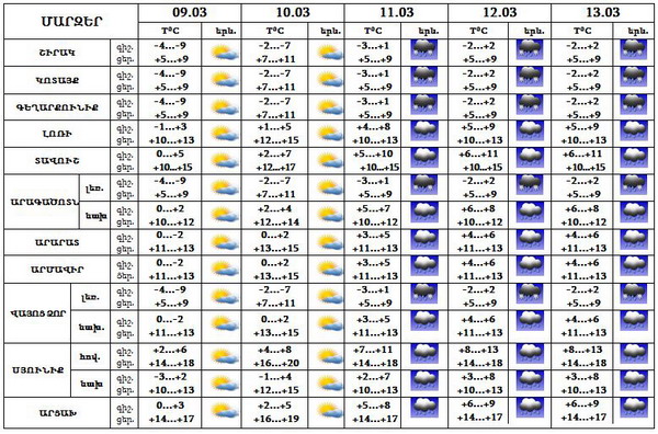 Մարտի 09-10-ին, 11-ի գիշերը սպասվում է առանց տեղումների եղանակ, 11-ին` կեսօրից հետո, 12-ին շրջանների զգալի մասում ժամանակ առ ժամանակ սպասվում են տեղումներ, լեռնային գոտիներում թաց ձյան և ձնախառն անձրևի, նախալեռնային և հովտային գոտիներում անձրևի տեսքով: