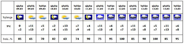 Քամին՝ հարավ-արևմտյան՝ 3-8 մ/վրկ արագությամբ: Օդի ջերմաստիճանը մարտի 10-ի ցերեկը և 11-ի գիշերը կբարձրանա 2-4 աստիճանով: