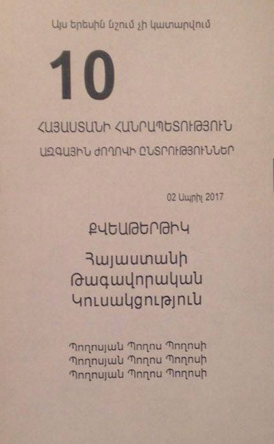 Քվեաթերթիկի վրա որեւէ գրառում, ասենք՝ սիրո կամ ատելության խոստովանություն, հայհոյանք կամ այլ տեսակի գրառումներ կատարելու դեպքում, եւ էական չէ, թե որ էջի վրա է, տվյալ քվեաթերթիկը համարվելու է անվավեր: