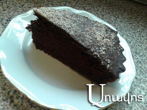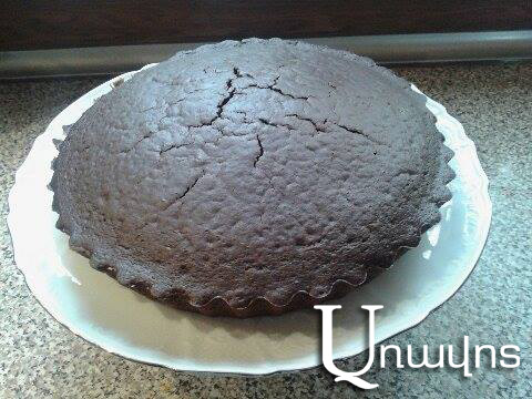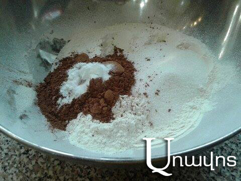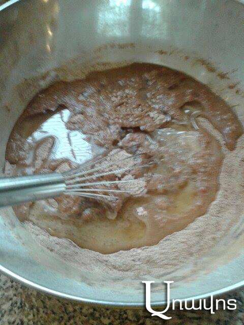 Սկզբում ամանի մեջ լցրեք բոլոր չոր մթերքները` ալյուրը, շաքարավազը, կակաոն եւ սոդան: Գդալով լավ խառնեք: Ապա ավելացրեք հեղուկ մթերքները` ջուրը, բուսայուղը եւ քացախը: Հարիչով լավ հարեք: Լցրեք ջեռոցի թավայի մեջ եւ դրեք 180 աստիճան տաքացրած ջեռոցը` մոտ 40 րոպեով: 40 րոպեից փայտե չոփիկով ստուգեք պատրաստվածության աստիճանը` եթե չոր դուրս գա, կարող եք ջեռոցն անջատել, եթե ոչ` թողեք եւս 10 րոպե թխվի: