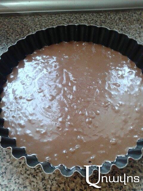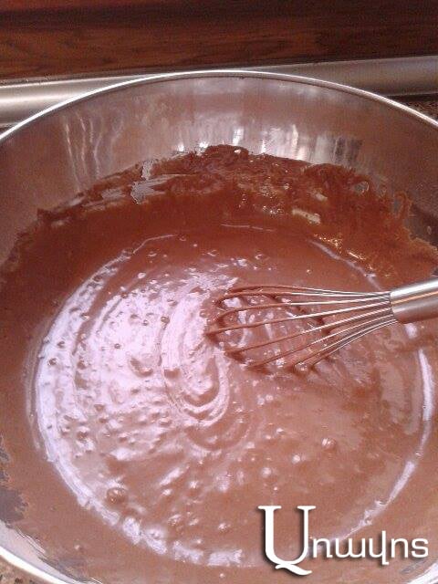 Դրեք կրակին` անընդհատ խառնելով հասցրեք եռման աստիճանի, պետք է դառնա միատարր զանգված: Մեջը գցեք 50 գրամ դառը սեւ շոկոլադը, շարունակեք խառնել, որ շոկոլադն ամբողջությամբ հալվի: Ավելացրեք նաեւ մեկ գդալ բուսայուղը եւ վերցրեք կրակից: Տաք տաք վիճակում լցրեք սառած տորթի վրա: Կարող եք վրան ընկույզի փշրանքով զարդարել: