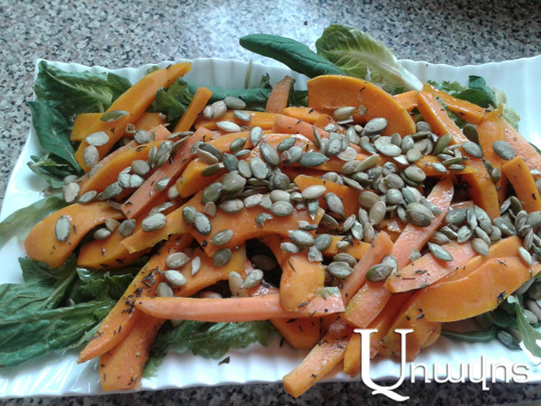 Մինչ դդումը պատրաստվում է ջեռոցում, լավ լվացեք թարմ կանաչիները` սպանախը, ռուկոլան, մառոլը: Սպանախի կապի միջից ընտրեք հնարավորինս մատղաշ տերեւները (ավելի խոշորները կարող եք հետո տապակել, իսկ աղցանի համար պետք են մատղաշ ու անվնաս տերեւները): Կանաչեղենը լավ չորացրեք, ապա դասավորեք աղցանամանի մեջ, վրան աղ արեք, մի քիչ ձիթայուղ: Երբ դդումն ու գազարը պատրաստ լինեն, շարեք կանաչիների վրա: