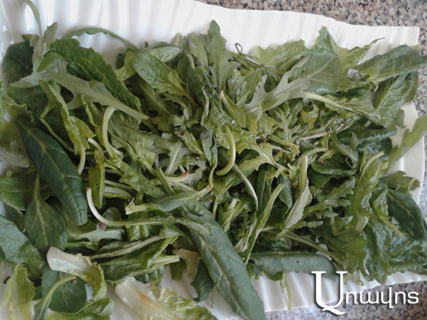 Ռուկոլա- մի քանի ճյուղիկ (պարտադիր չէ, կարելի է փոխարինել հազարատերեւով` մառոլով)