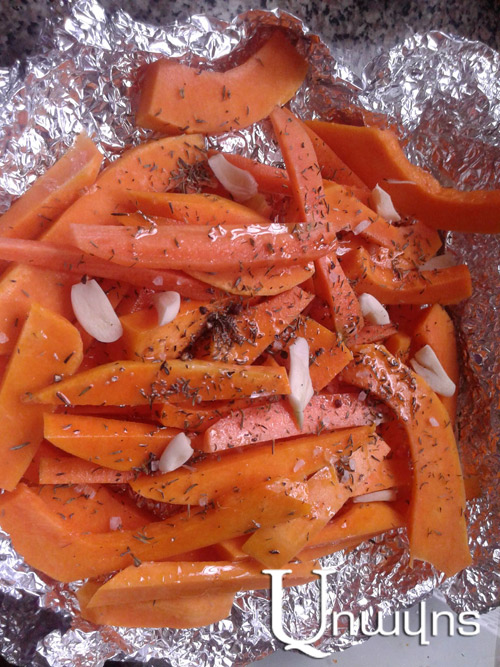 Դդումը եւ գազարը մաքրել, կտրատել բարակ եւ նեղ շերտերի: Լավ լվանալ, չորացնել, լցնել փայլաթիթեղի (ֆոլգա) վրա, վրան աղ, պղպեղ, չորացրած կանաչիներ եւ ձիթայուղ անել, դնել 200 աստիճան տաքացրած ջեռոցը` մոտ 20 րոպեով: