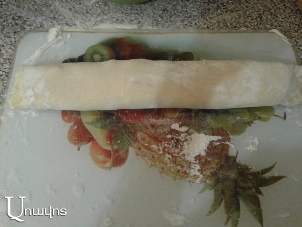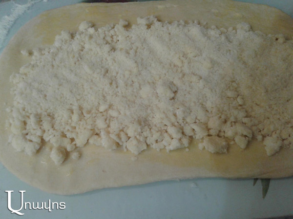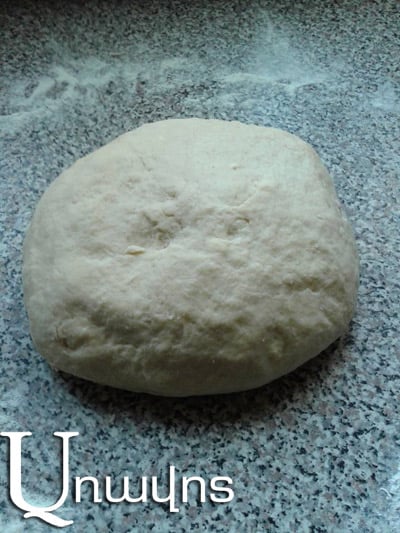 Գոլ կաթի մեջ լուծել խմորիչը, ավելացնել կես բաժակ ալյուր, լավ խառնել, թողնել հանգստանա մոտ կես ժամ, մինչեւ պղպջակներ հայտնվեն: Ապա ավելացնել թթվասերը, հալած կարագը եւ ձուն, լավ հարել: Քիչ-քիչ ավելացնել մնացած ալյուրը, խառնել, շարունակել ավելացնել ալյուր այնքան, մինչեւ դառնա հունցելու համար պիտանի, բայց ոչ շատ պինդ խմոր, լավ հունցել` մոտ 10 րոպե: Մի քանի անգամ խմորը հարվածել սեղանին: Ապա ծածկել որեւէ խորը թասով, թողնել մնա մեկ ժամ: