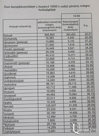 Քիչ առաջ ԿԸՀ անդամ Սեյրան Շահսուվարյանը լրագրողներին ներկայացրեց տեղեկություններ՝ մինչև ժամը 14:00-ն քվեարկությանը մասնակցած ընտրողների թվի վերաբերյալ` ըստ ընտրական տարածքների: