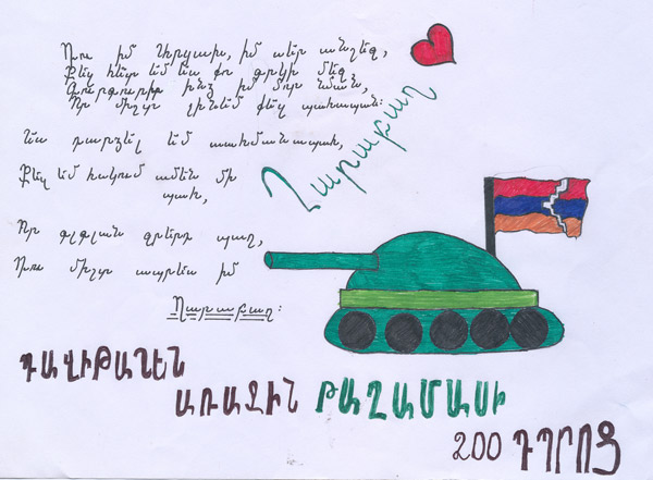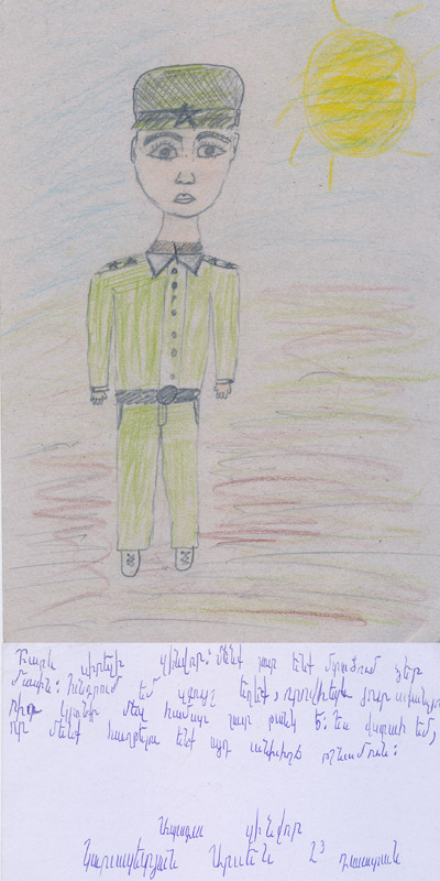 Ես ցանկանում եմ իմ եւ իմ մարտական ընկերների անունից շնորհակալություն հայտնել Ձեզ` իմ փոքրիկ բարեկամներ: Այժմ արդեն ես խորապես համոզված եմ, որ մեր հայրենիքի ապագան, հանձինս Ձեզ` հուսալի եւ ամուր ձեռքերում է:
