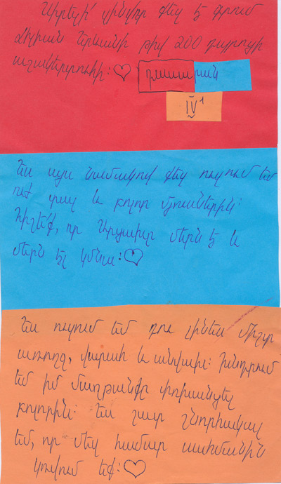 Թե մեր մանուկների անվարժ ձեռքով գրված նամակները (երբեմն նամակի հեղինակը երկրորդ, երրորդ դասարանցի էր) որքան սեր ու ջերմություն էին պարունակում, դժվար է անգամ նկարագրել: Ուստի այսօր`քառօրյայից մեկ տարի անց, ձեզ եմ ներկայացնում այդ նամակները, նամակներ, որ մեր երեխաները ուղարկել էին մեզ…նամակներ, որ ես Թալիշից հետս Երեւան եմ բերել եւ մինչեւ օրս սրբությամբ պահում եմ…