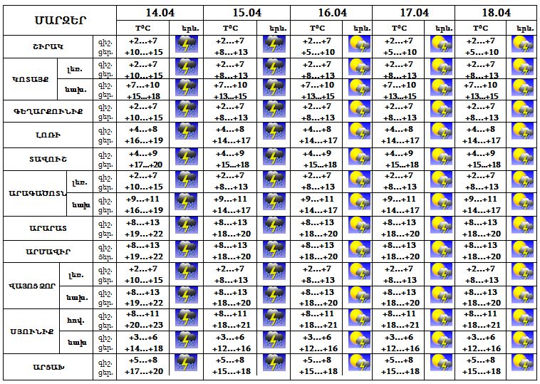 Ապրիլի 14-15-ը շրջանների զգալի մասում ժամանակ առ ժամանակ սպասվում է անձրև և ամպրոպ, 16-18-ը` հատկապես օրվա երկրորդ կեսին, սպասվում է կարճատև անձրև և ամպրոպ, առանձին վայրերում` քամու ուժգնացում՝ 18-23 մ/վ արագությամբ: