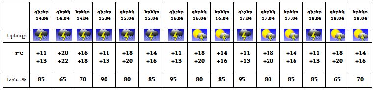 Ապրիլի 14-15-ը ժամանակ առ ժամանակ սպասվում է անձրև և ամպրոպ, 16-18-ը` հատկապես օրվա երկրորդ կեսին, սպասվում է կարճատև անձրև և ամպրոպ, հնարավոր է քամու ուժգնացում՝ 15-20 մ/վ արագությամբ: