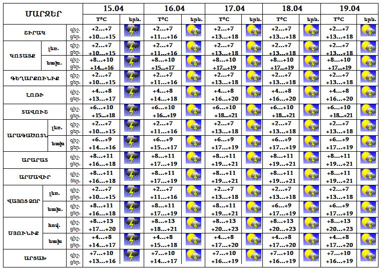 Ապրիլի 15-ին շրջանների զգալի մասում ժամանակ առ ժամանակ սպասվում է անձրև և ամպրոպ, 16-19-ը՝ հատկապես օրվա երկրորդ կեսին՝ կարճատև անձրև և ամպրոպ, առանձին վայրերում հնարավոր է կարկուտ, ամպրոպների ժամանակ քամու ուժգնացում՝ 18-23 մ/վ արագությամբ: