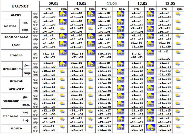 Օդի ջերմաստիճանը 9-10-ն աստիճանաբար կբարձրանա 2-3, 12-ին կնվազի 3-4 աստիճանով: