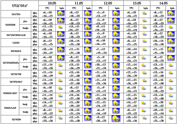 Օդի ջերմաստիճանը մայիսի 10-ին կբարձրանա 2-3, 12-ին կնվազի՝ 4-6 աստիճանով, այնուհետև աստիճանաբար կբարձրանա: