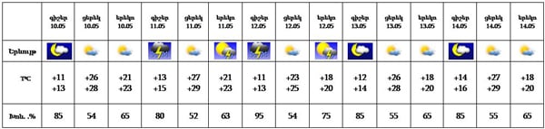 Մայիսի 10-ին, 14-ին քաղաքի առանձին հատվածներում երեկոյան ժամերին հնարավոր է ամպրոպային բնույթի կարճատև անձրև, 11-12-ին հատկապես գիշերը և կեսօրից հետո սպասվում է անձրև և ամպրոպ, ամպրոպի ժամանակ սպասվում է քամու ուժգնացում 15-18մ/վ: