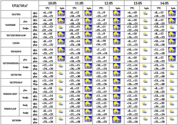 Օդի ջերմաստիճանը մայիսի 10-ին կբարձրանա 2-3, 12-ին կնվազի՝ 4-6 աստիճանով, այնուհետև աստիճանաբար կբարձրանա: