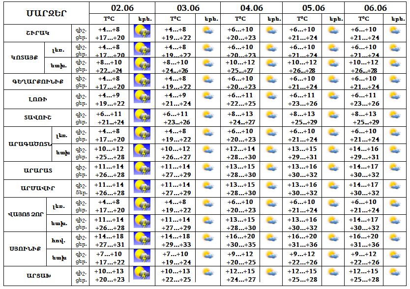 Հունիսի 2-ի երեկոյան ժամերին շրջանների զգալի մասում սպասվում է կարճատև անձրև և ամպրոպ, ամպրոպի ժամանակ սպասվում է քամու ուժգնացում` 19-24 մ/վ, առանձին վայրերում հնարավոր է կարկուտ, 3-6-ը սպասվում է առավելապես առանց տեղումների եղանակ: