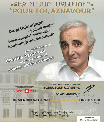 Այսօր Ազգային օպերային թատրոնում Էդուարդ Թոփչյանի ղեկավարությամբ, Հայաստանի ազգային ֆիլհարմոնիկ նվագախմբի ընկերակցությամբ, էստրադային եւ օպերային հայ երգիչների մատուցմամբ առաջին անգամ Շառլ Ազնավուրի երգերից 13-ը կհնչեն հայերեն: Երգերի թարգմանությունը ամերիկաբնակ Պերճ Թյուրաբյանինն է: Նա ծնունդով Եգիպտոսից է, ուսանել է Կահիրեի Մխիթարյան վարժարանում, ապա ֆրանսիական քոլեջում: