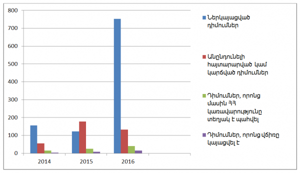 2013-ին Հայաստանից ստացվել է 196 դիմում, 2014-ին՝ 156, 2015-ին՝ 122, իսկ 2016-ին՝ 753: