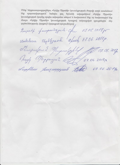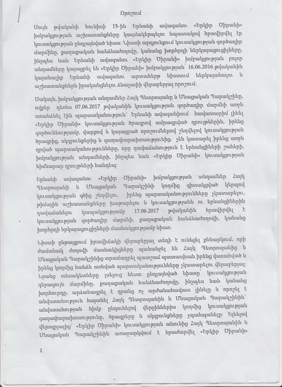 Զեկույցում նաեւ նշված է. «2017 թվականի հունիսի 16-ին, Երևանի քաղաքապետարանում տեղի ունեցած Երևանի ավագանու արտահերթ նիստը` երևանցիների համար կարևոր հարցերի վերաբերյալ խիստ հագեցած օրակարգով «Երկիր Ծիրանի» կուսակցությունը դիտարկել էր, որպես կարևոր պայքարի հարթակ և իր Երևանի ավագանու անդամներին գործուղել էր այդ նիստին: «Երկիր Ծիրանի» կուսակցության Երևանի ավագանու անդամները, ովքեր ստանձնել էին պարտականություն (տես` 07.06.2017 թվականի պարտավորությունների ստանձնման հուշագիր, 15.06.2017 «Երկիր Ծիրանի» կուսակցության Երևանի ավագանու խմբակցության նիստի արձանագրություն, 15.06.2017 «Երկիր Ծիրանի» կուսակցության Ժողովի արձանագրություն) իրենց ելույթներով և հարցերով, թիմային աշխատանքի ներքո բարձրաձայնել երևանցիներին հուզող խնդիրները և ներկայացնել հարցերի լուծման համար պահանջներ, Մնացական Պարակշիևի և Հայկ Պետրոսյանի անգործության դրսևորման պատճառով պատշաճ չեն կարողացել իրականացնել»: