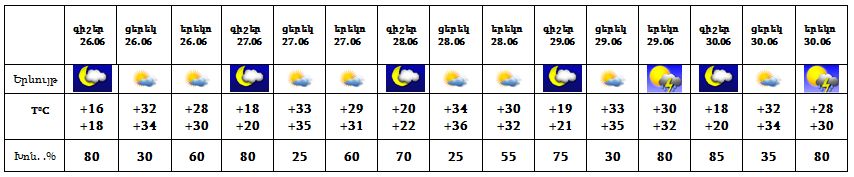Հունիսի 26-27-ը սպասվում է առանց տեղումների եղանակ, 28-30-ի երեկոյան ժամերին հանրապետության առանձին՝ առավելապես հյուսիսային շրջաններում սպասվում է կարճատև անձրև և ամպրոպ, առանձին վայրերում հնարավոր է կարկուտ։