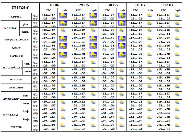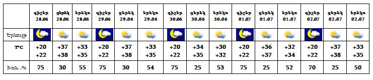 Հունիսի 28-30-ը հատկապես հյուսիսային առանձին շրջաններում երեկոյան ժամերին սպասվում է կարճատև անձրև և ամպրոպ։ Հուլիսի 1-2-ը սպասվում է առանց տեղումների եղանակ: