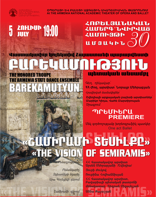 Վաստակավոր կոլեկտիվ Հայաստանի պարարվեստի «Բարեկամություն» պետական անսամբլը պատրաստվում է իր հիմնադրման 30-ամյակին նվիրված երեկոյին: Հոբելյանական միջոցառումը կկայանա հուլիսի 5-ին, Ազգային օպերային թատրոնում: