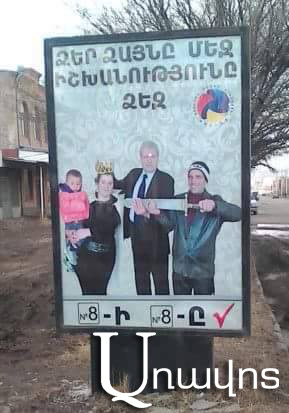 Իսկ ԱԺ ընտրությունների ժամանակ, երբ «Օհանյան-Րաֆֆի-Օսկանյան» դաշինքը պարոն Հովհաննիսյանի թեկնածությունն էր առաջադրել Շիրակի մարզում, նրա ցուցապաստառը, որտեղ մարզպետարանի պաշտոնյան նկարվել էր սոցիալապես անապահով մի ընտանիքի հետ՝ թուրը ձեռքերին, թագը գլխներին, դարձել էր ամենաքննարկվողը։։