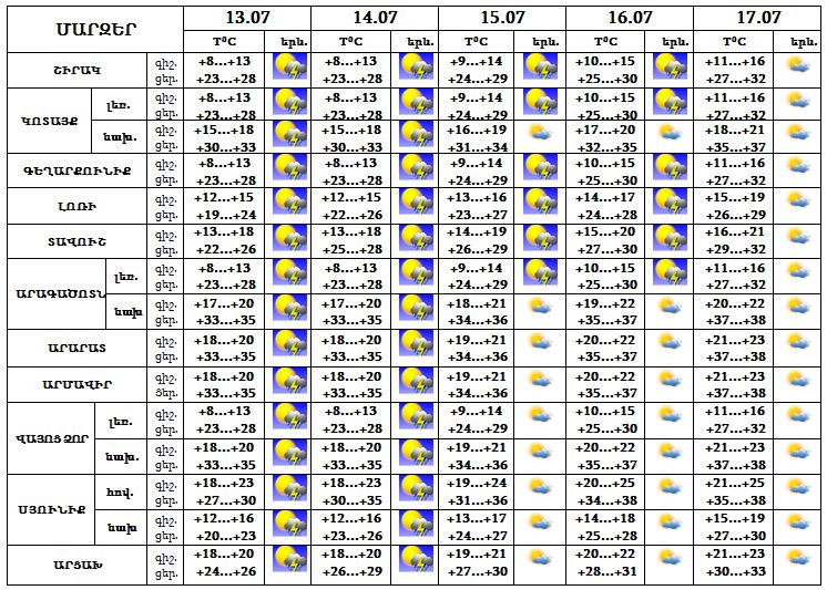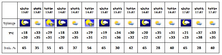Հուլիսի 13-14-ի երեկոյան ժամերին շրջանների զգալի մասում, 15-16-ը հյուսիսային շրջաններում սպասվում է կարճատև անձրև և ամպրոպ, առանձին հատվածներում հնարավոր է կարկուտ։ 17-ին սպասվում է առանց տեղումների եղանակ: