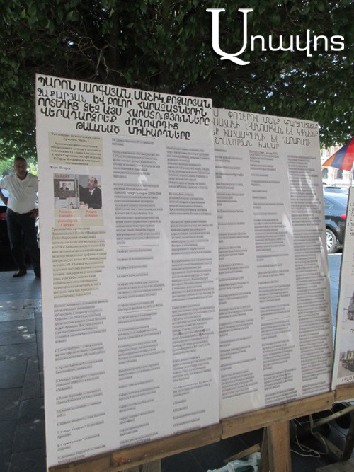 Այսօր կառավարության շենքի առաջ քաղաքացի Արսեն Ավետիսյանը մի քանի մեծ ցուցապաստառ էր տեղադրել, որոնցում պատկերված էին զենքի տեսակներ: Ցուցապաստառներից մեկն էլ ՀՀ նախկին նախագահ Ռոբերտ Քոչարյանին պատկանող բիզնեսների մասին տեղեկատվություն էր պարունակում: Քաղաքացի Ավետիսյանը մատնացույց անելով լուսանկարների զենքերը, կառավարությանը հորդորում էր ունենալ դրանցից: Նրա խոսքով, եթե ապրիլյան պատերազմին այդ զենքերը հայկական կողմն ունենար, ապա ընդհանրապես զոհեր չէինք ունենա: