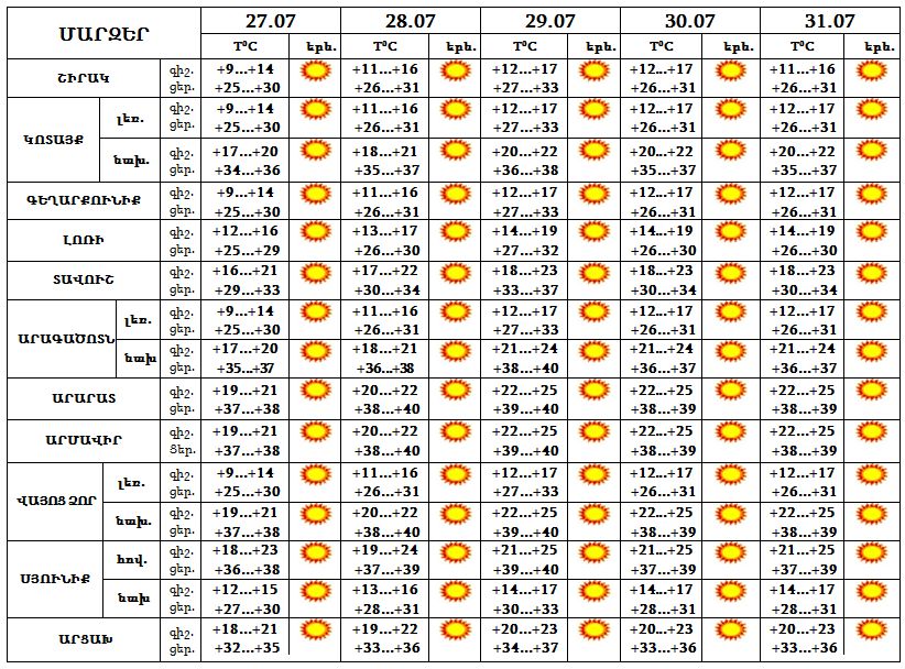 Հուլիսի 27-30-ը հանրապետությունում սպասվում է բարձր ջերմային ֆոն, Երևանում, Արարատյան դաշտում և Սյունիքի հովիտներում ցերեկը կանխատեսվում է մինչև 38…40 աստիճան տաքություն և բարձր կարգի հրդեհավտանգ իրավիճակ: Օդի միջին օրական ջերմաստիճանն այդ օրերին բարձր կլինի նորմայից 4-6 աստիճանով: