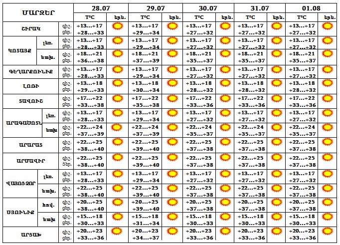 Հուլիսի 28-ից օգոստոսի 1-ը հանրապետությունում սպասվում է բարձր ջերմային ֆոն, Երևանում, Արարատյան դաշտում և Սյունիքի հովիտներում ցերեկը կանխատեսվում է մինչև 38…39 աստիճան տաքություն և բարձր կարգի հրդեհավտանգ իրավիճակ: Օդի միջին օրական ջերմաստիճանն այդ օրերին բարձր կլինի նորմայից 4-6 աստիճանով: