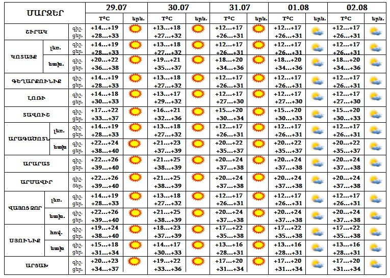 Հուլիսի 29-ից օգոստոսի 2-ը հանրապետությունում սպասվում է բարձր ջերմային ֆոն, Երևանում, Արարատյան դաշտում և Սյունիքի հովիտներում ցերեկը կանխատեսվում է մինչև 38…39 աստիճան տաքություն և բարձր կարգի հրդեհավտանգ իրավիճակ: Օդի միջին օրական ջերմաստիճանն այդ օրերին բարձր կլինի նորմայից 4-6 աստիճանով: