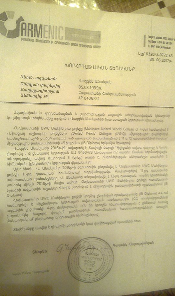 Հնդկաստանում ուսուցումը իրականացվում է միջազգային, հանրակրթական ավագ դպրոցի ծրագրով։ Ուսման մեկ տարվա վարձը կազմում է 27.000 ԱՄՆ դոլարին համարժեք գումար ։ Ուսման վարձը ֆինանսավորել են IDEA հիմնադրամը, Հնդկաստանի Մահինդրա քոլեջը։ Ավարտելուց հետո Վազգենը կստանա IB կարգի դիպլոմ, որը ունի միջազգային ճանաչում, տղաս հետագա ուսման հնարավորություն կստանա արտերկրի լավագույն բուհերից մեկում։ Ուսումը կիսատ թողնելու դեպքում նա չի կարող այդ դիպլոմը ստանալ, որովհետեւ տարիքային սահմանափակում կա: Ես երաշխավորում եմ, որ 2018 թ. մայիսին հայրենիք վերադառնալով՝ նա իր պարտքը կտա հայրենիքին։ Ամուսինս 15 տարի անբասիր ծառայում է ՀՀ զինված ուժերում։ Մենք քաջ գիտակցում ենք հայրենիքին անմնացորդ ծառայելու վեհ գաղափարը»։