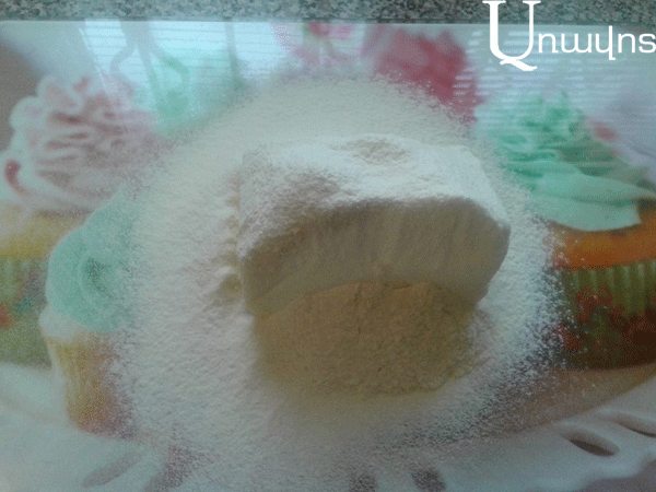 Խմորը դրեք 200-220 աստիճան տաքացրած ջեռոցը, 7-8 րոպեից խմորը հանեք, ազատեք ծանրությունից եւ եւս 3-4 րոպեով դրեք ջեռոցը, որ կարմրի: