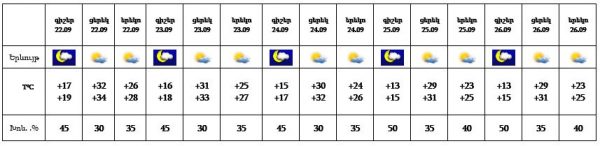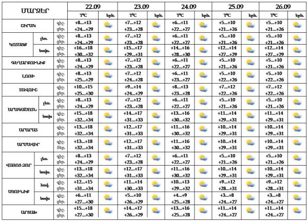 Սեպտեմբերի 22-26-ը սպասվում է առավելապես առանց տեղումների եղանակ: