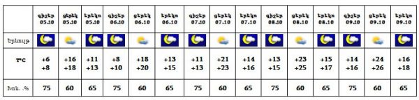 Հոկտեմբերի 5-ի գիշերը Սյունիքում և Արցախում սպասվում են տեղումներ։ Հոկտեմբերի 5-ի ցերեկը, 6-9-ը սպասվում է առանց տեղումների եղանակ: