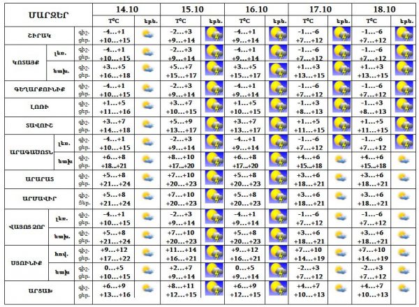 Հոկտեմբերի 14-ին սպասվում է առանց տեղումների եղանակ: 15-16-ը շրջանների զգալի մասում, 17-18-ը առավելապես հյուսիսային շրջաններում երեկոյան ժամերին սպասվում է կարճատև անձրև և ամպրոպ, ամպրոպի ժամանակ հնարավոր է քամու ուժգնացում՝ 15-20մ/վ արագությամբ: