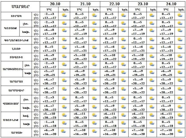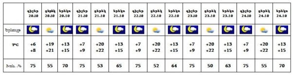 Օդի ջերմաստիճանը 20-ին, 21-ի գիշերը կբարձրանա 2-3 աստիճանով, այնուհետև էապես չի փոխվի: