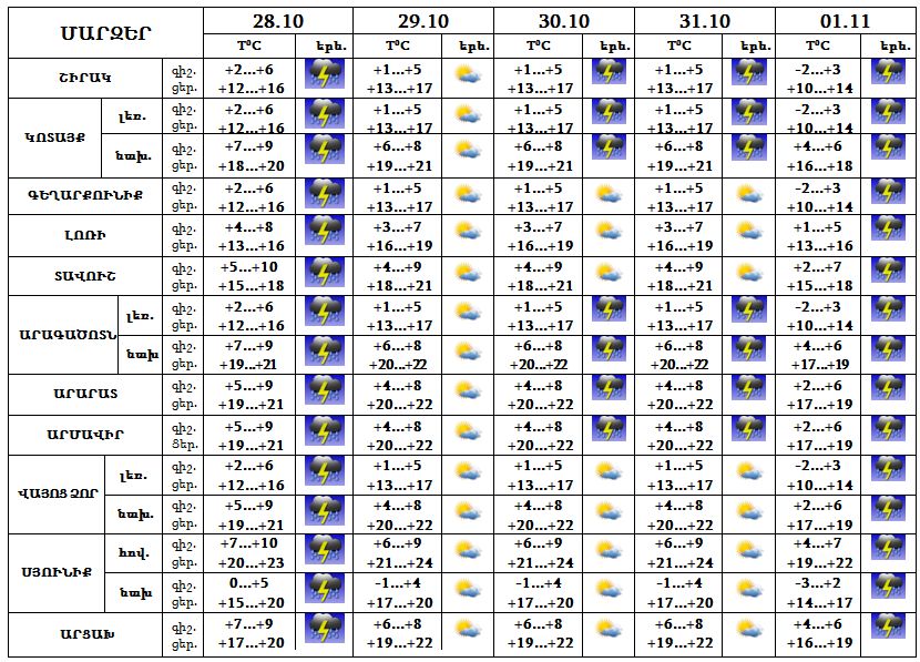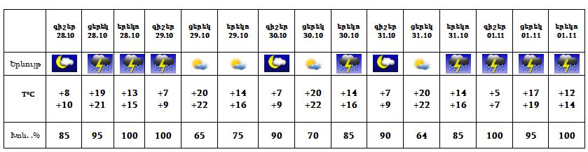 Հոկտեմբերի 28-ին` օրվա երկրորդ կեսին, 29-ի գիշերը, նոյեմբերի 1-ին շրջանների զգալի մասում, 30-31-ը արևմտյան շրջաններում սպասվում է անձրև և ամպրոպ, առանձին շրջաններում՝ քամու ուժգնացում՝ 15-20մ/վ արագությամբ: 29-ի ցերեկը սպասվում է առավելապես առանց տեղումների եղանակ: